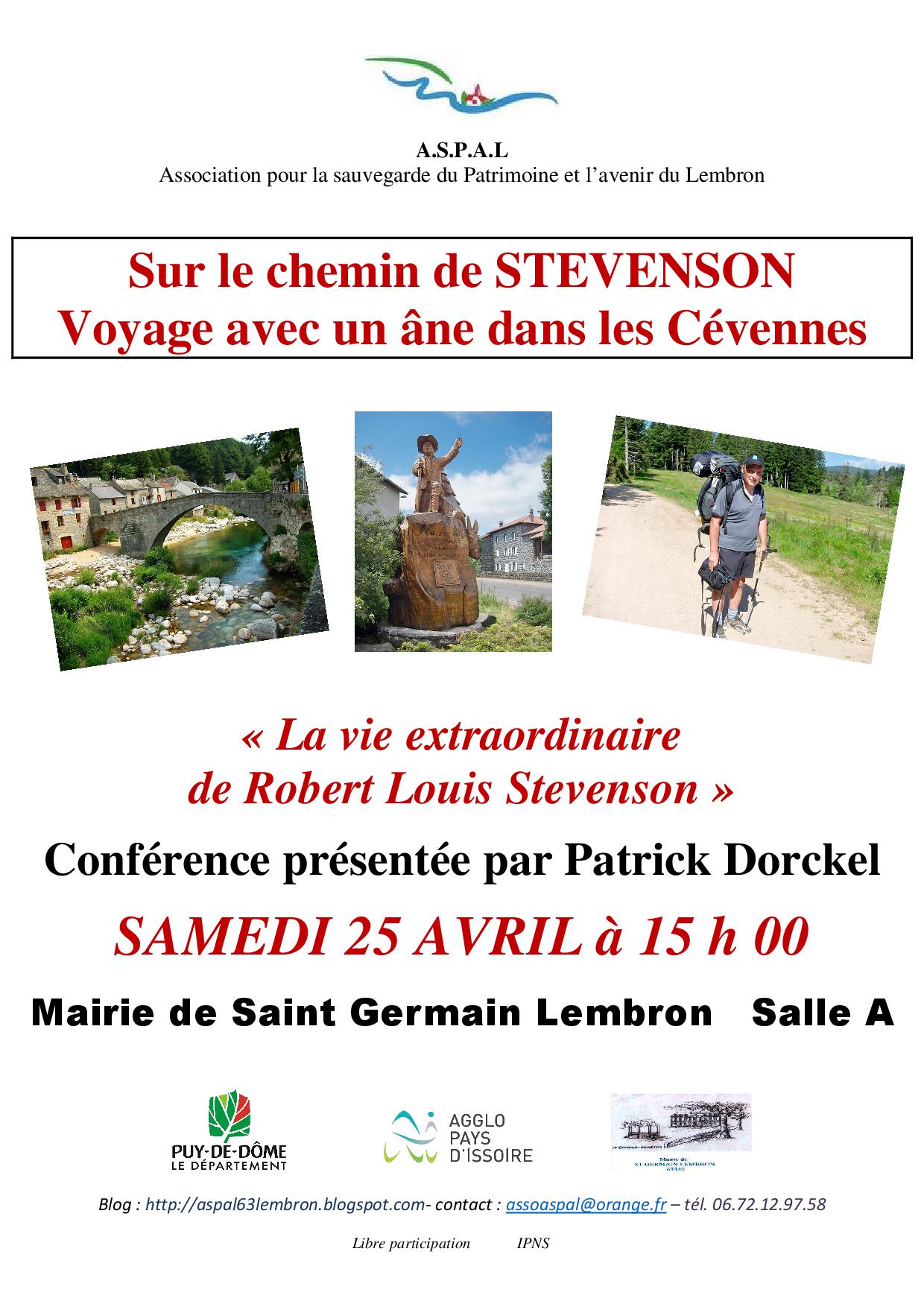 • ASPAL – conférence « La vie extraordinaire de Robert Louis Stevenson » – samedi 25 avril à 15h00 – Salle A de la mairie