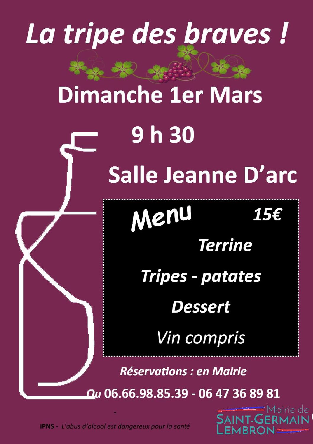 La tripe des braves ! dimanche 1er mars 2026 à 9h30 – Salle Jeanne d’Arc de ST-GERMAIN-LEMBRON